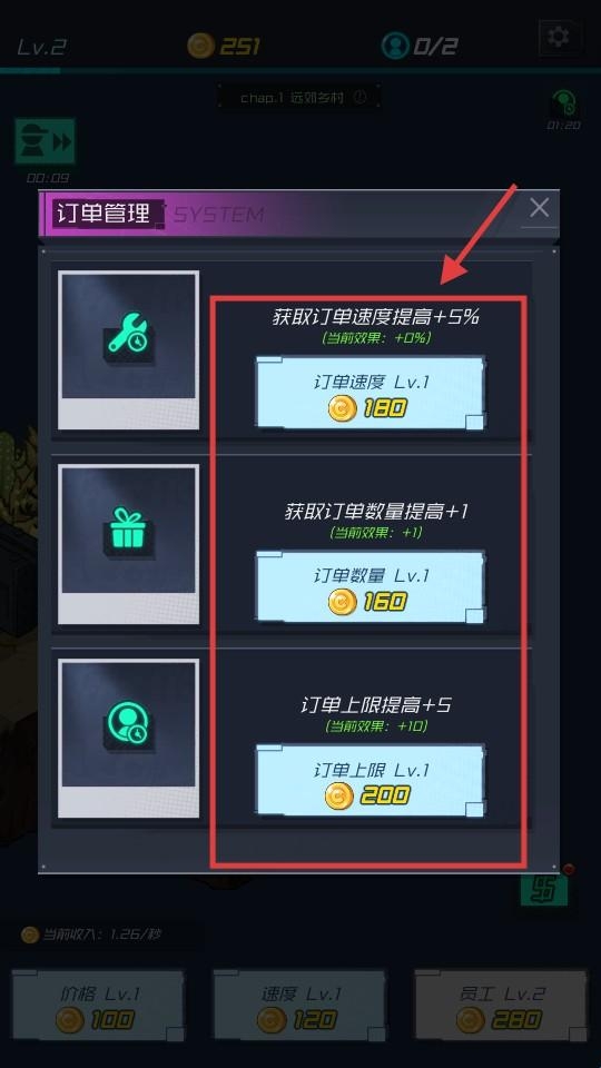 4、进入“订单管理”界面,消耗金币升级“订单速度”“订单数量”“订单上限”,优化订单相关能力。