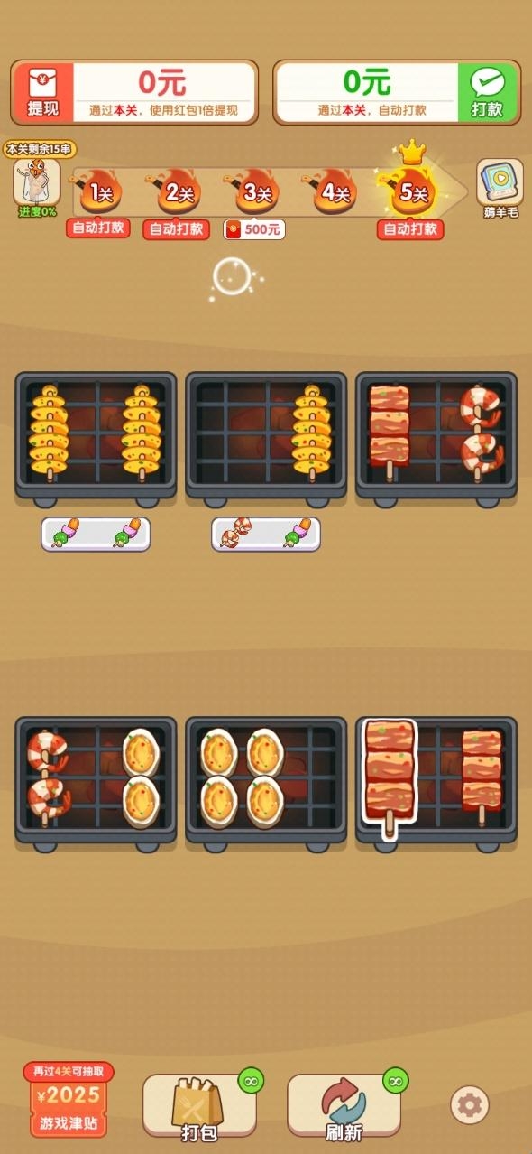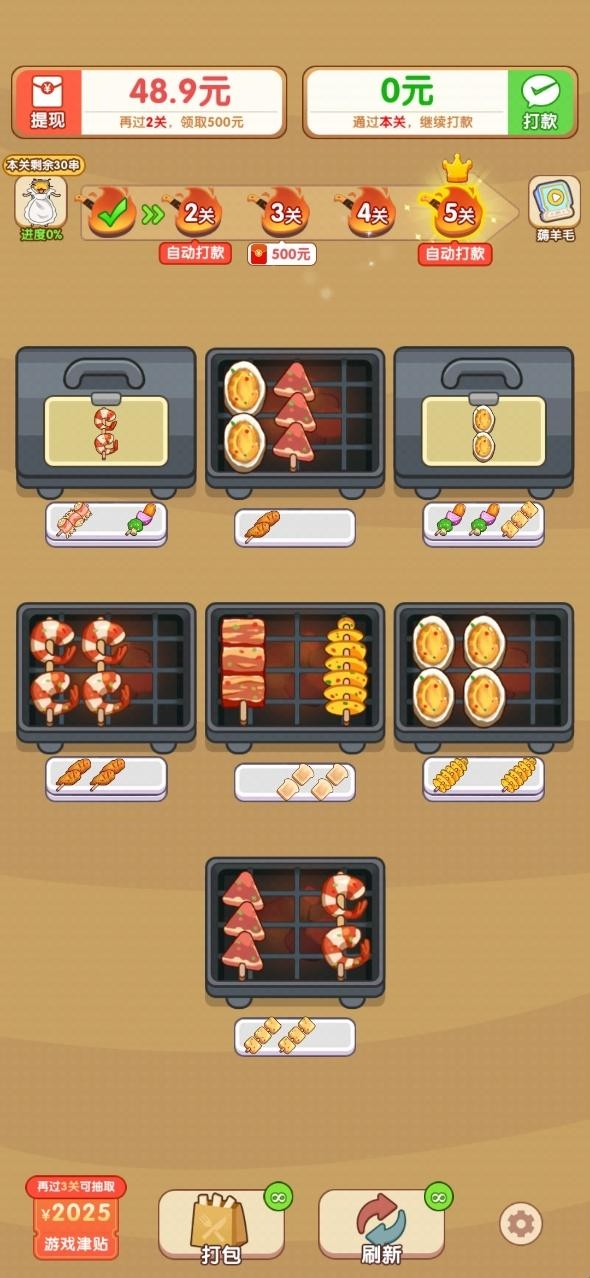 3、游戏中可以见识到各种各样的美味烤串,以这些烤串作为主题元素,能够很好的激发玩家们的闯关兴趣。