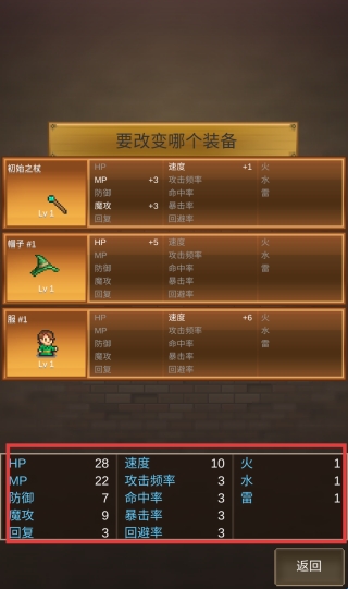 1、游戏开始,熟悉角色基础属性,包括等级(Lv1)、生命值(HP28)、魔法值(MP22)等,了解当前装备及其加成效果。