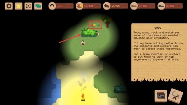 4、引导村民探索地图,让其在果树等区域收集食物,积累资源,为村庄壮大做准备哦。