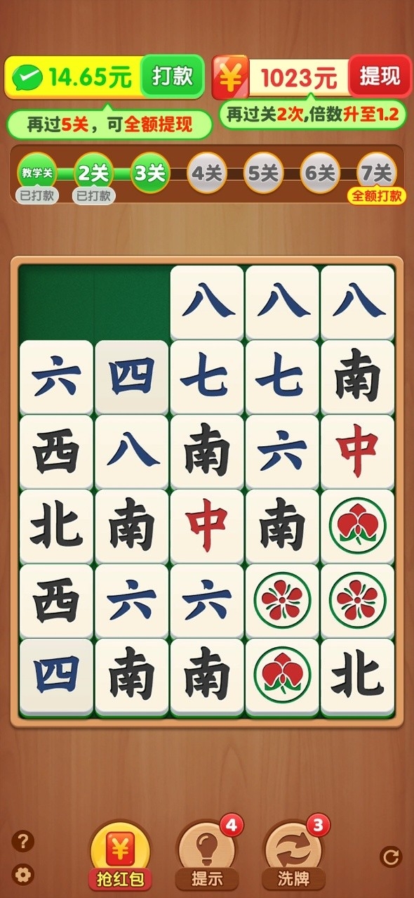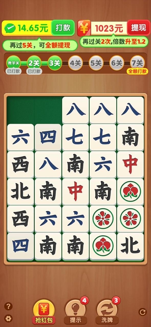 3、轻点屏幕上任意三个一样的麻将牌就能消除,各个年龄层的玩家轻松掌握。