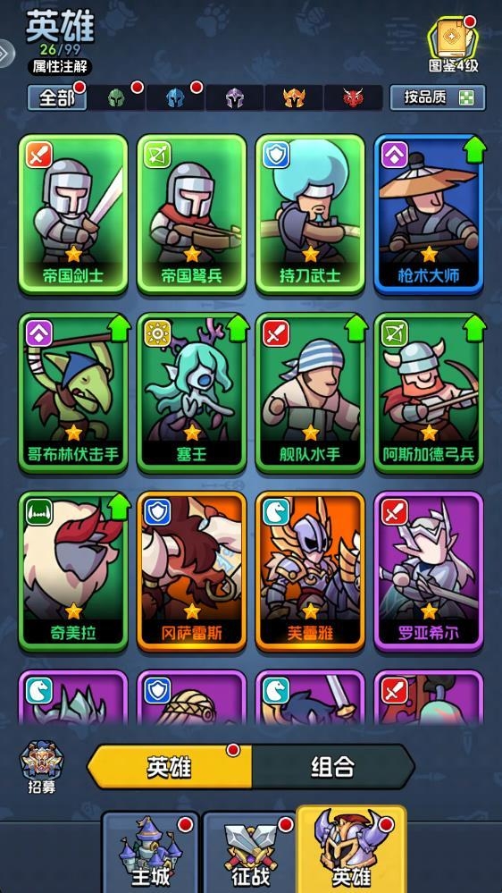4、有很多英雄可以让玩家去招募来进行战斗,不同的兵种组合会让你体验到不一样的闯关乐趣。