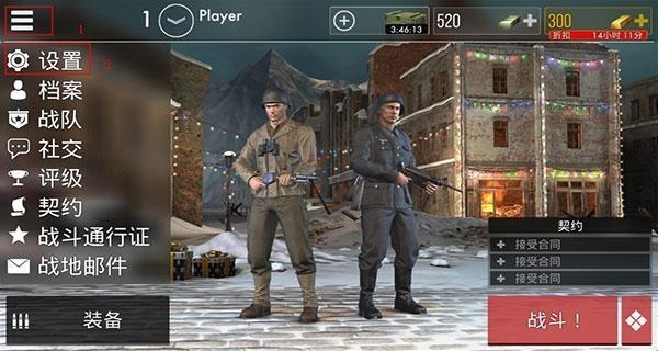 1、下载安装好二战英雄手机版,运行游戏后登录进入下图界面,在左上角有三杠标志,选择设置;
