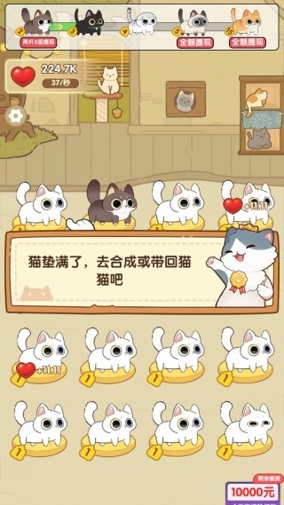 1、游戏中有着不同等级的猫咪,玩家需要努力将其合成解锁,自然可以不断弹出对应的福利。