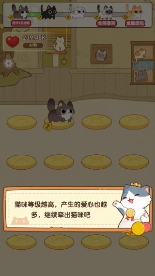 1、玩家可以领养心仪的猫咪,并通过喂食、清洁等日常照料提升猫咪的等级和星级。