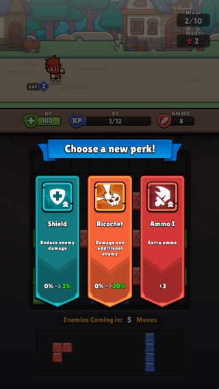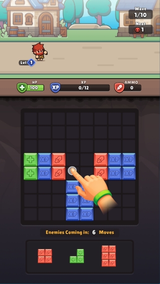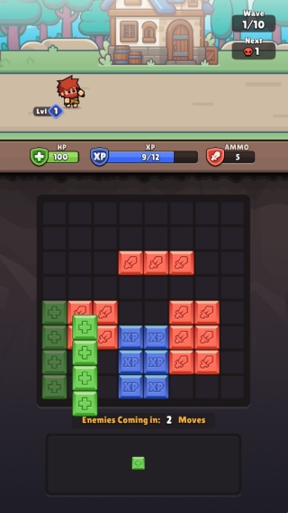 3、敌人即将进攻时,优先消除大量红色子弹方块获取Ammo,同时兼顾绿色HP方块维持血量。