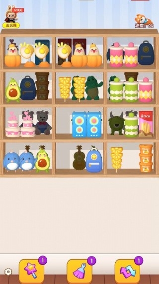 1、视觉设计:采用卡通化布局,色彩柔和,物品造型可爱(如圆润的水果、方形的盒子),减少视觉压力,营造治愈氛围。