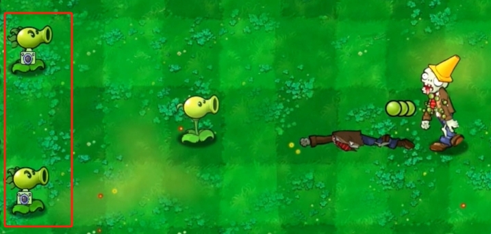 监工双发射手自身不会发射豌豆,但每当豌豆射手后方有一个监工双发射手,豌豆射手就会额外发射两颗豌豆