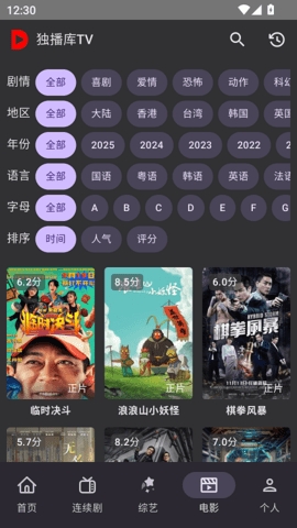 支持通过片名、演员名、导演名或拼音首字母快速检索目标内容,搜索响应迅速且结果准确。