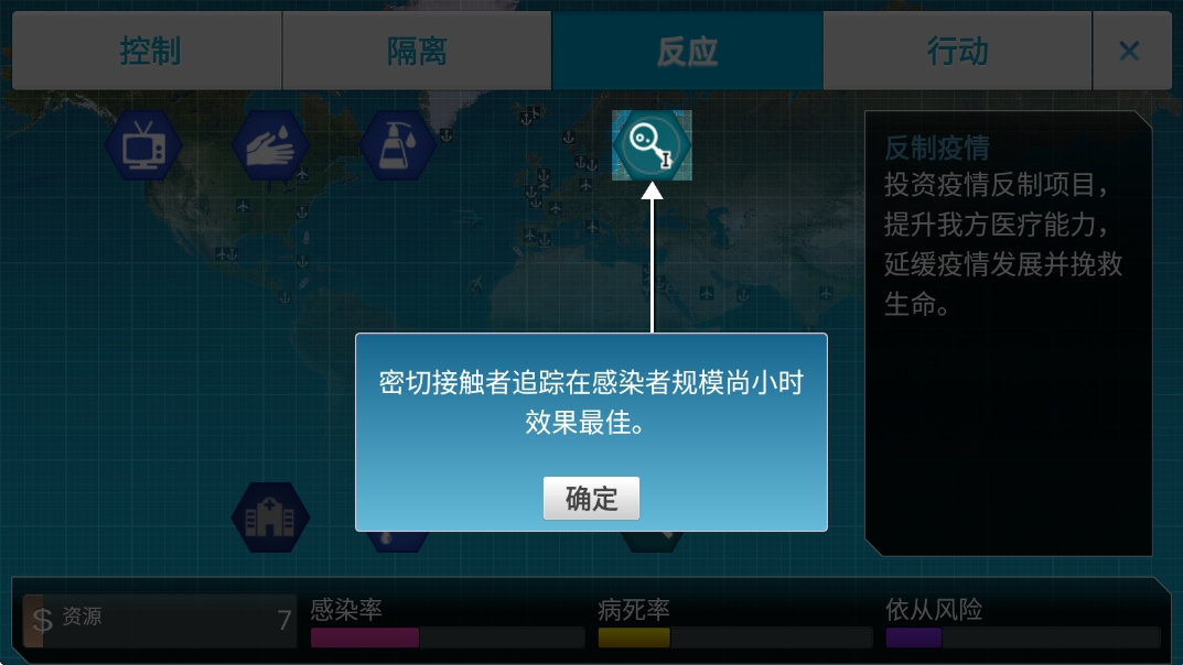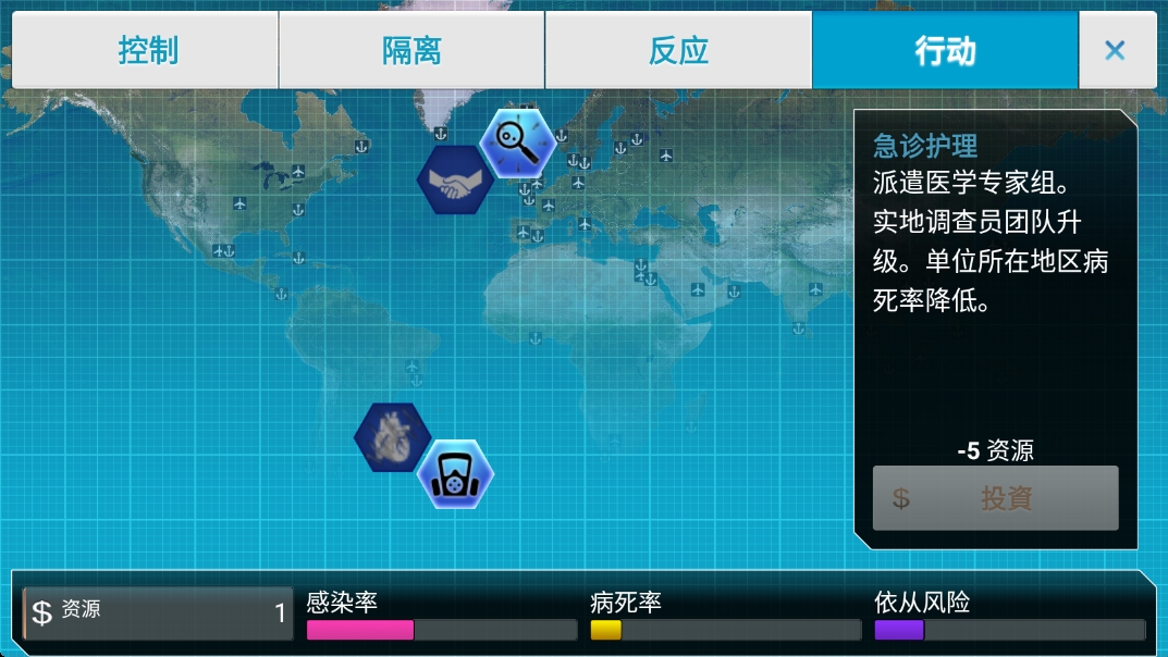 3.收集资源进行建设投资,防控病情的发展。
