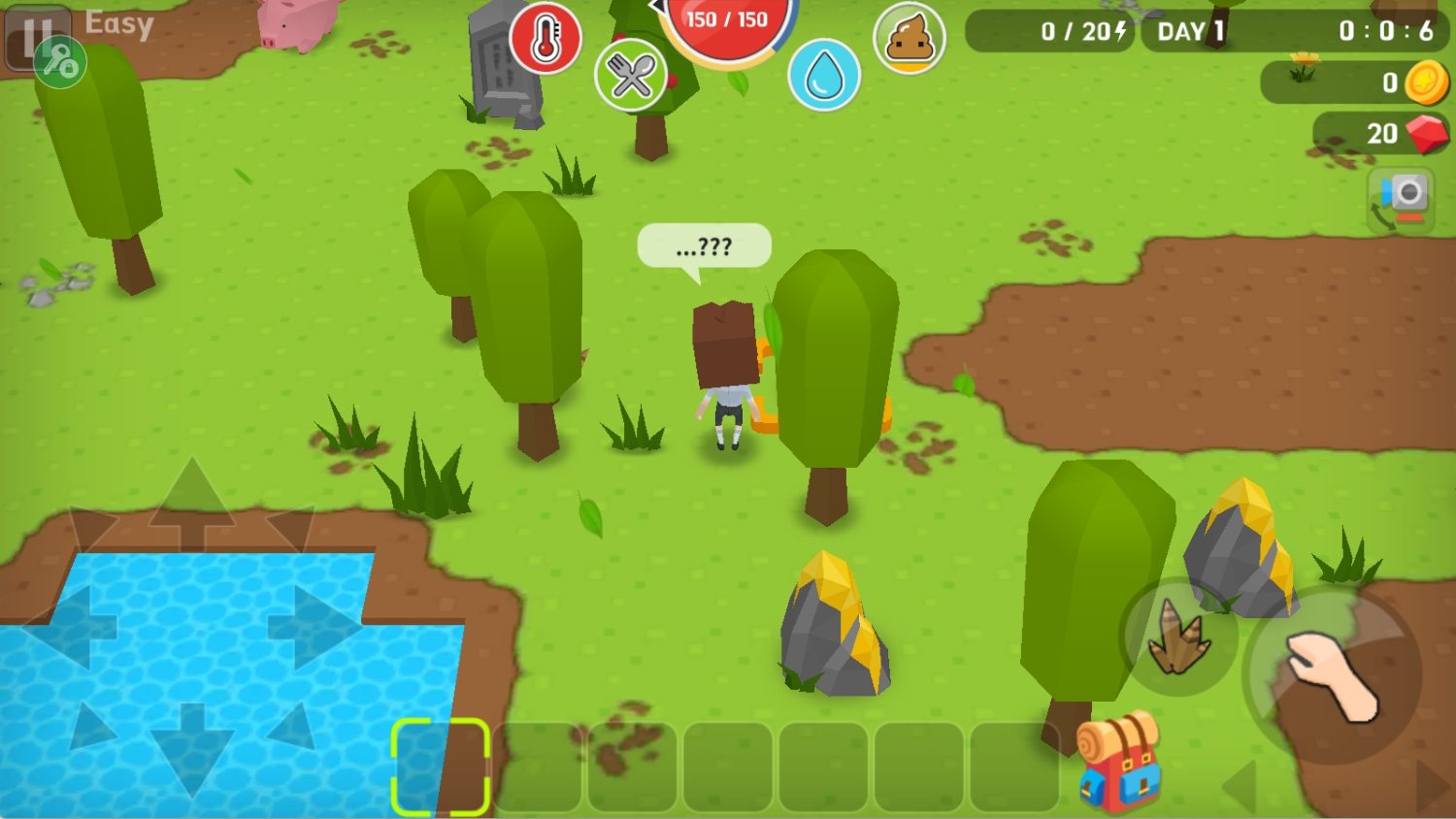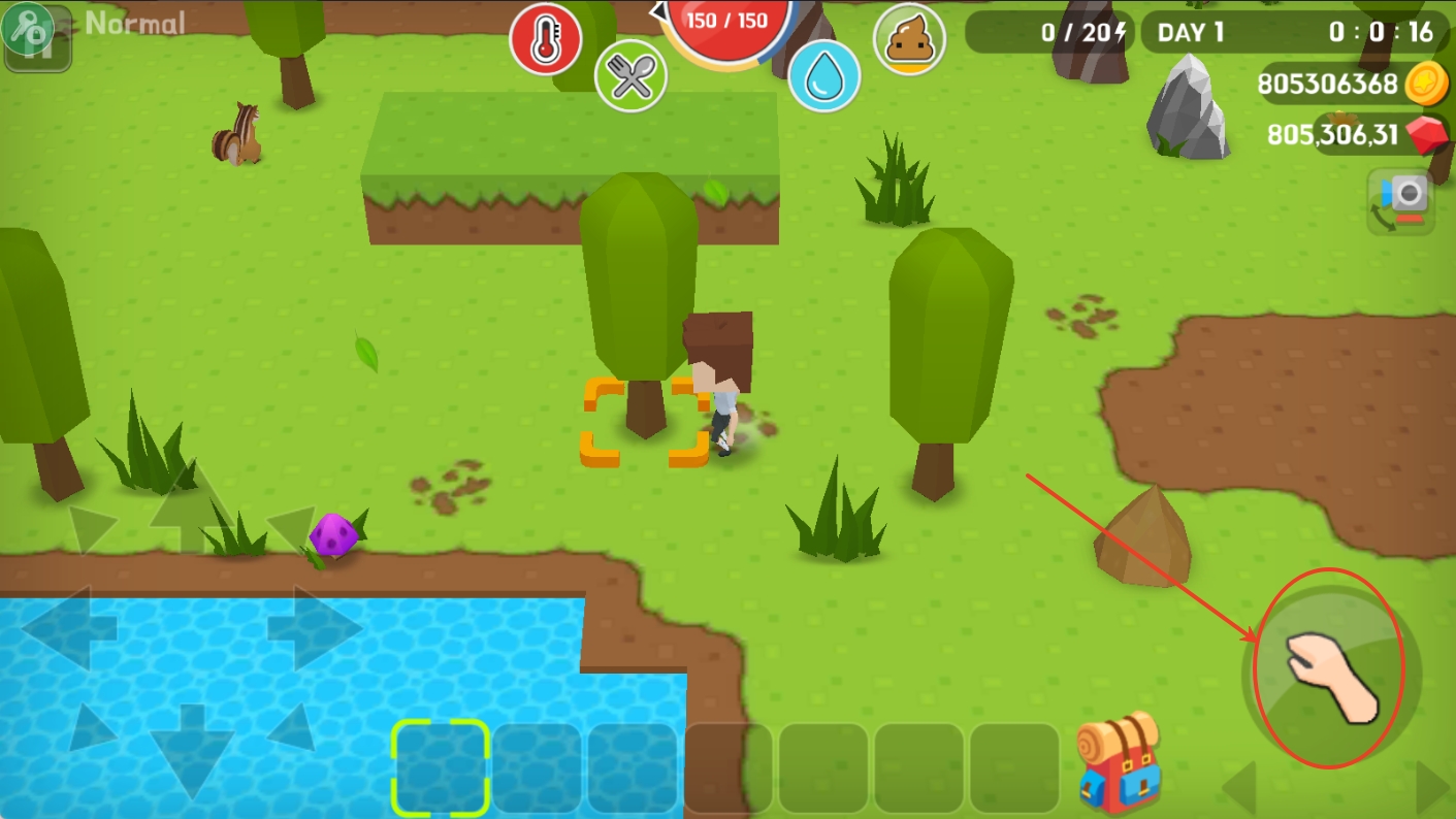 5、关卡内点击右下角挖掘按键,即可采集树木、矿石等,让玩家展开一场精彩生存之旅。
