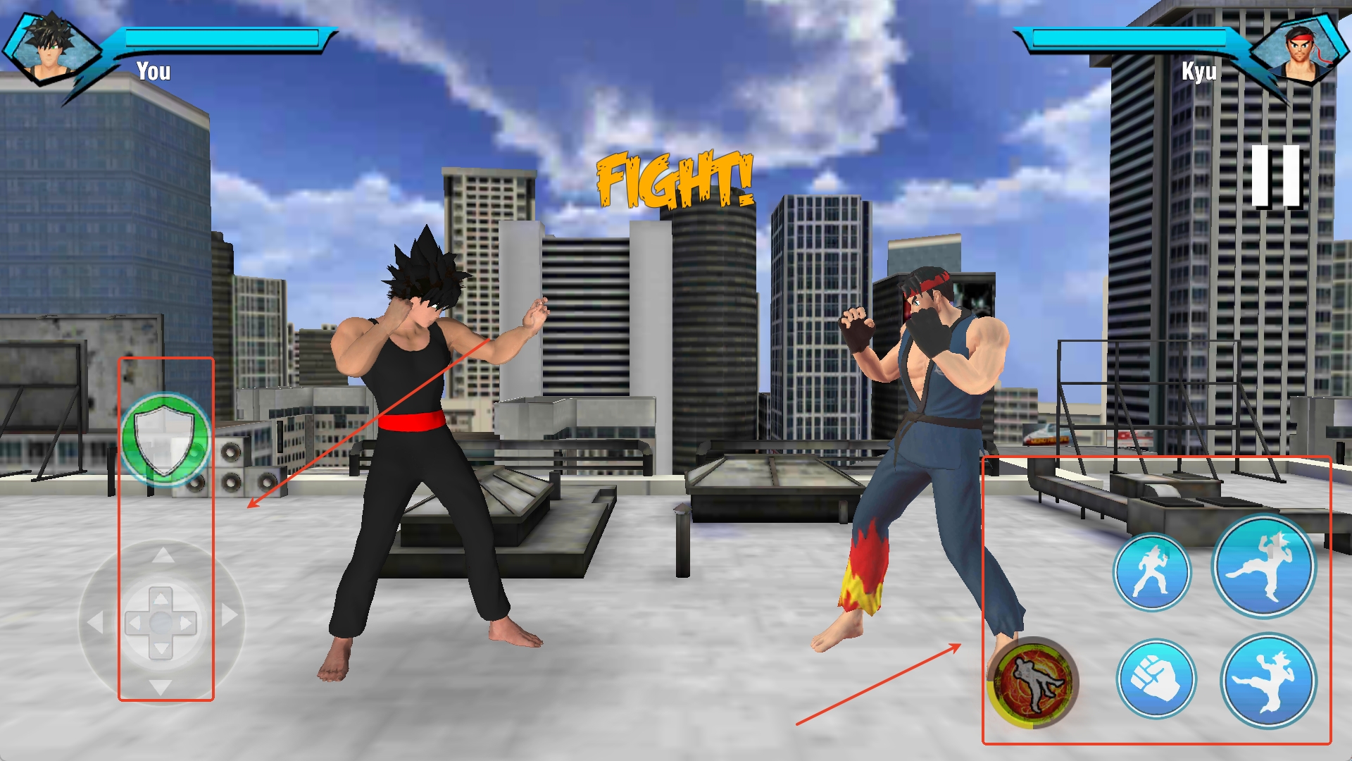 4、左下角是防御和移动按键,右下角是攻击和技能按键。