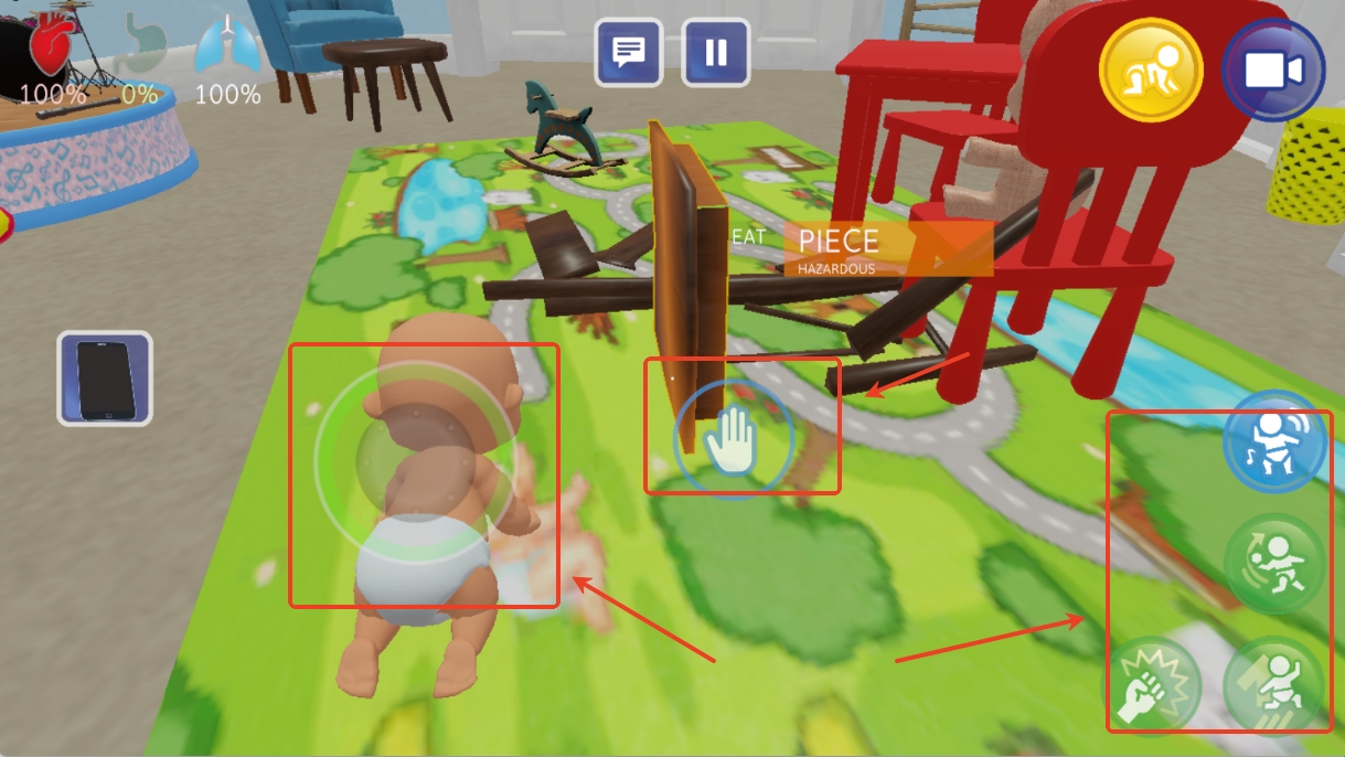 4、左下角是控制按键,中间是拾取按键、右下角是跳跃、跳舞和攻击按键。