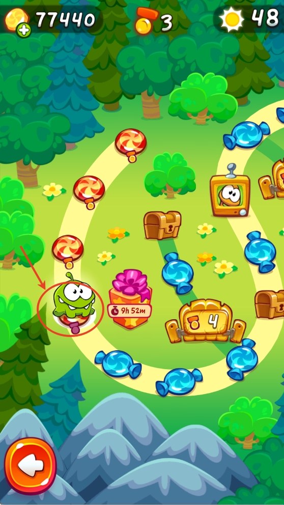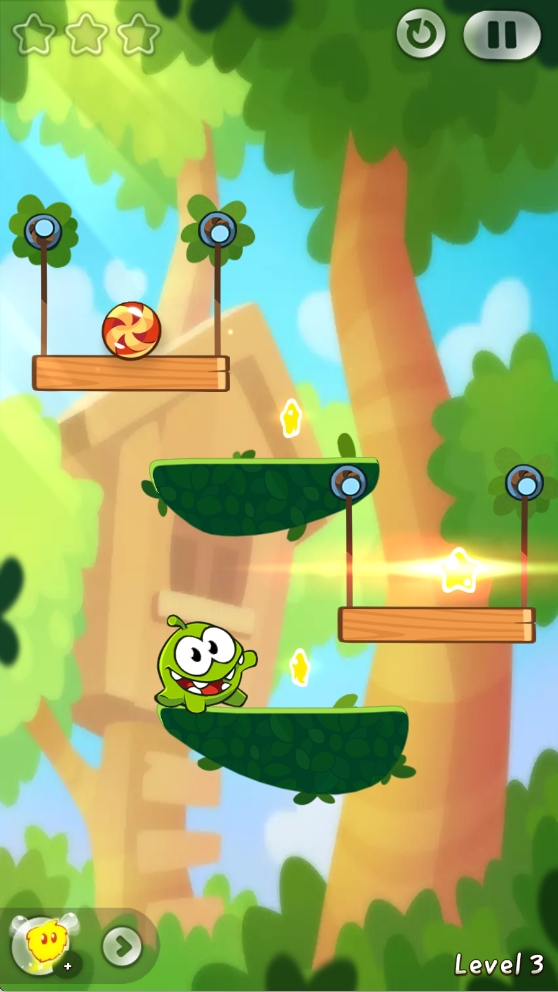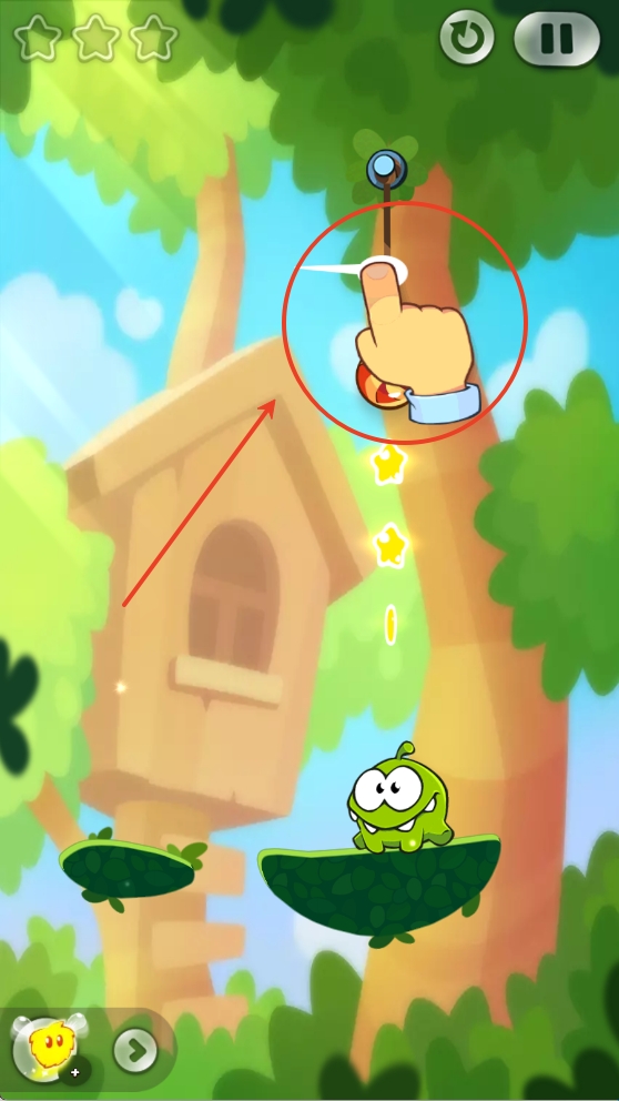 3、通过滑动割绳子的方式,让糖果落入小动物的口中即可通关。