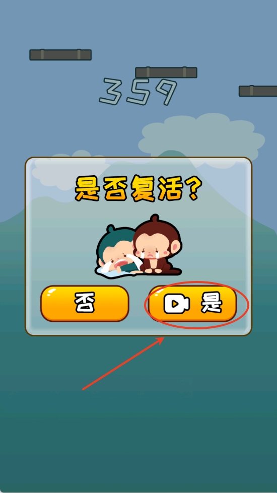 4、如果两只小猴子同时掉下去闯关失败,当然玩家也可以选择看广告复活小猴子。
