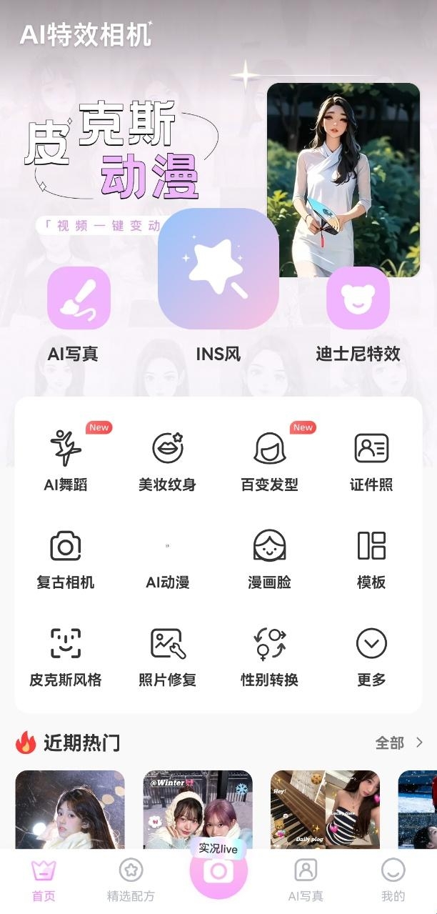 1、本站下载安装后进入首页,用户可以看到AI写真、INS风、迪士尼特效、百变发型等多种功能选项。