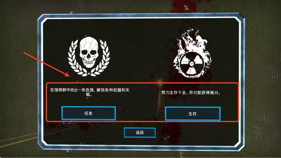 3、有两种模式供玩家自由选择,任务模式:有着丰富多样的关卡设计,能够解锁各种武器和天赋。生产模式:在一大波怪物的袭击中努力存活下去,尽可能的获取高分。