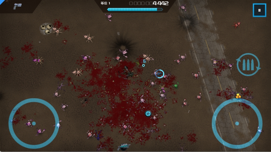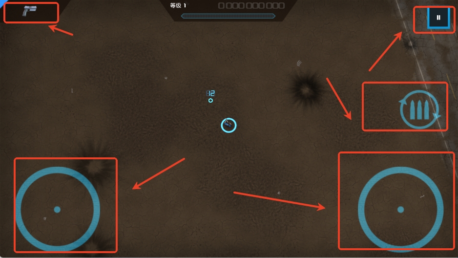 4、进入游戏后左上角是使用的武器,左下角师移动键,右上角是暂停键,下面两个分别是换弹键和控制射击方向键。