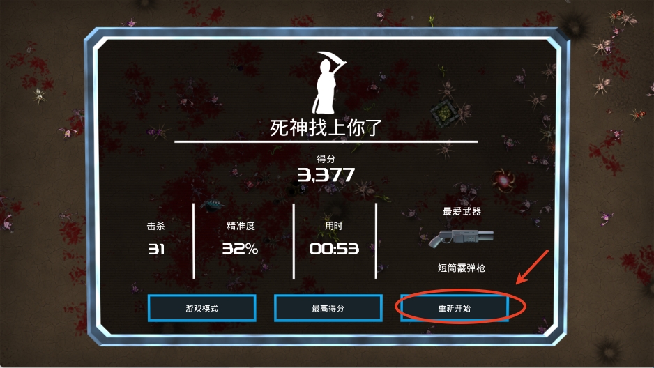 5、如果玩家阵亡过后可以点击重新开始,再一次进行挑战。