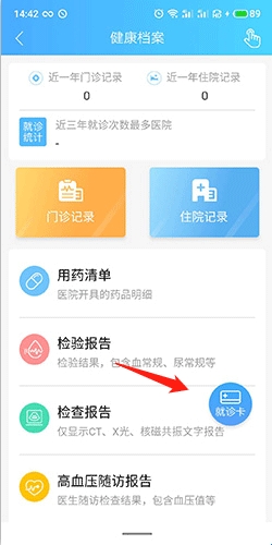 2、进入健康档案页面,点击右下角的“就诊卡”选项;