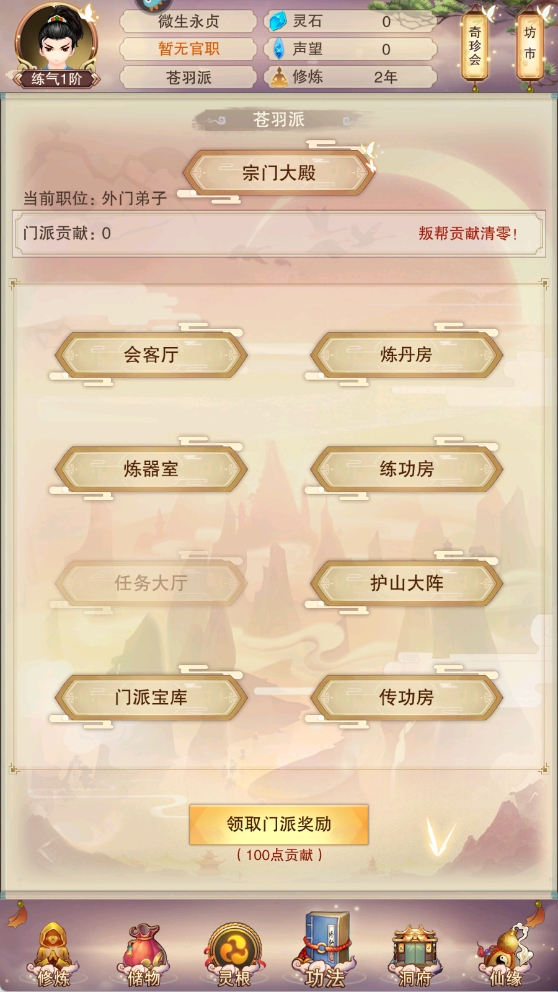 5、玩家还可在门派的炼器室、炼丹房、传功房中进行炼制、锻造及学习。这些功能房间的开启取决于门派的实力如何,所以想要更好的提升自身实力拜入一个强大的门派是很有必要的。玩家可在任务大厅接取任务来获取贡献点,贡献点可用于提升自身实力。