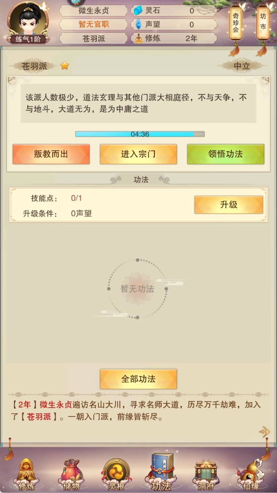 4、除了自身修炼外,玩家还可选择拜师学艺或是收集信物进入门派,通过消耗技能点来领悟新技能,再消耗灵气对其进行升级。