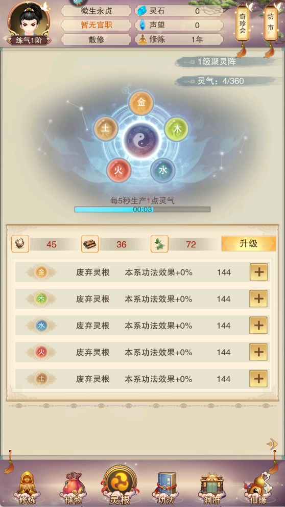 3、在灵根系统中,玩家可查看到人物五行灵根的品阶及功法加成效果。可通关升级灵气来提升品阶加强功法效果加成。灵气获取则是通关聚灵珠产生,可通关消耗相应材料对聚灵珠进行升级来提高聚灵效果。