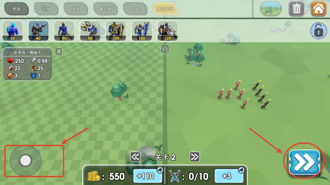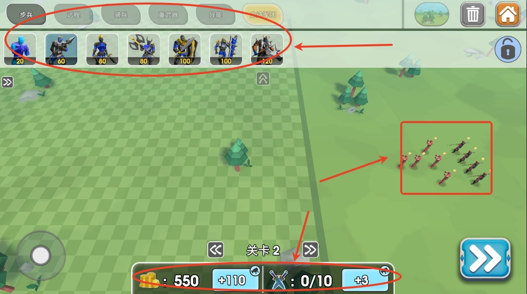 3、中下方是提供的金币和人数,上方是各种不同的兵种类型,玩家需要根据敌人的阵容来进行搭配。