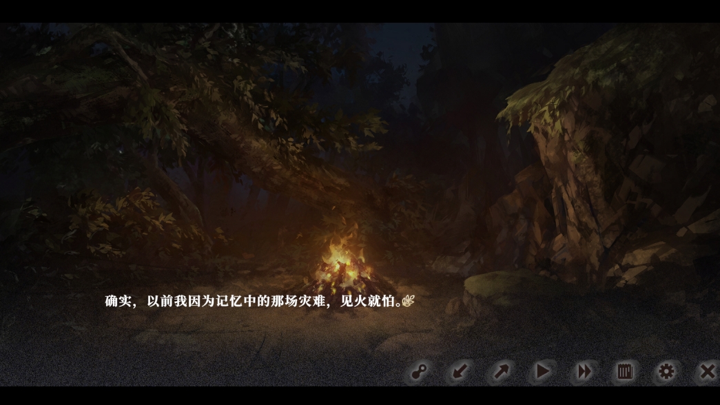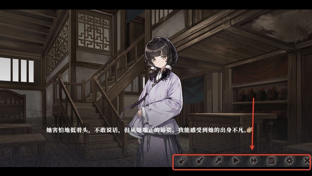 3、右下角的按键从右到左分别是隐藏绘画、设置键、历史对话、2倍速、系统自动对话、读取存档、存档、章节。