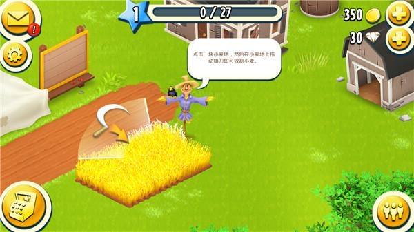 4、按照教程提示,点击小麦,选择镰刀,然后拖动镰刀收割整片小麦。