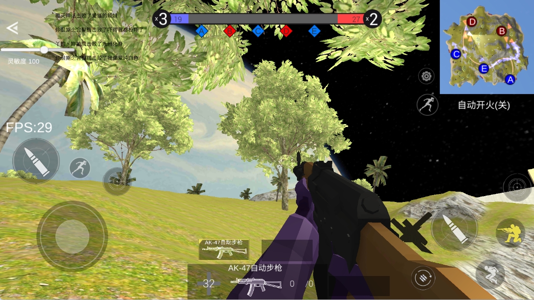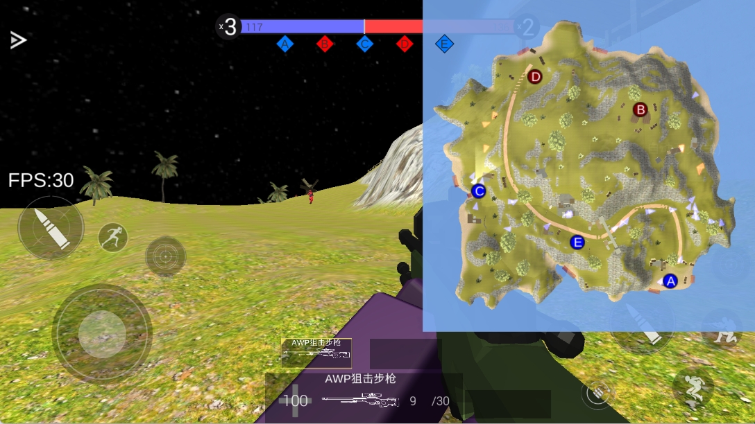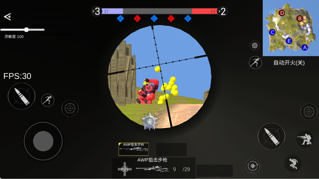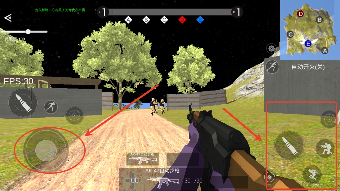 4、左下角是移动键,右下角是射击键、开镜键、下蹲键、跳跃键。