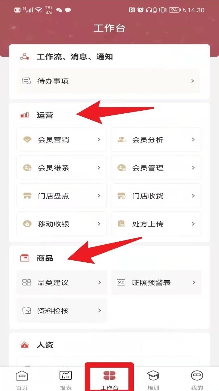 4、点击底部“工作台”,可在“运营”中进行会员管理、门店收货等操作,在“商品”中进行品类建议及证照预警查看。
