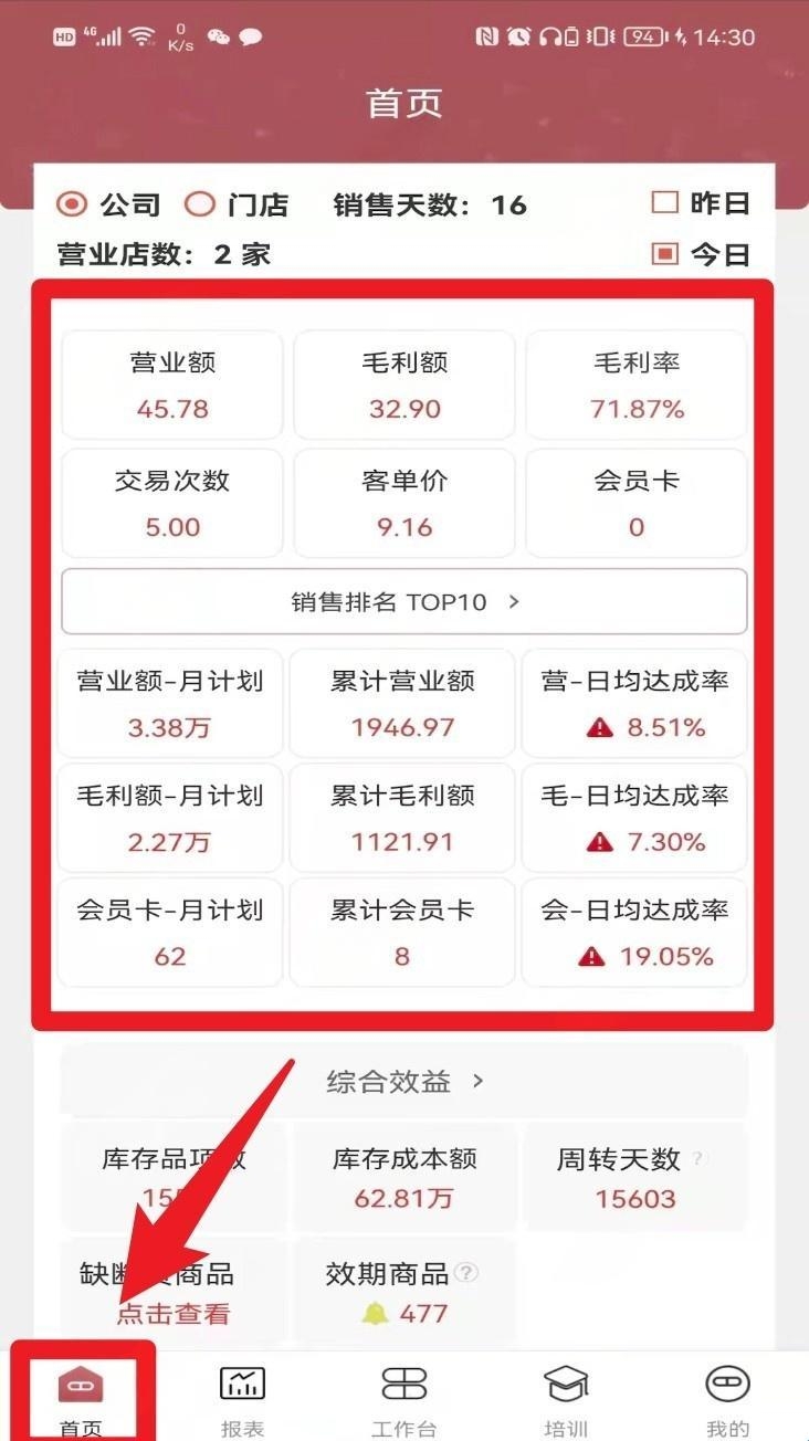 2、登录后进入首页,可查看公司及门店的营业额、毛利额、交易次数等关键数据,并通过顶部切换查看今日或昨日的经营情况。