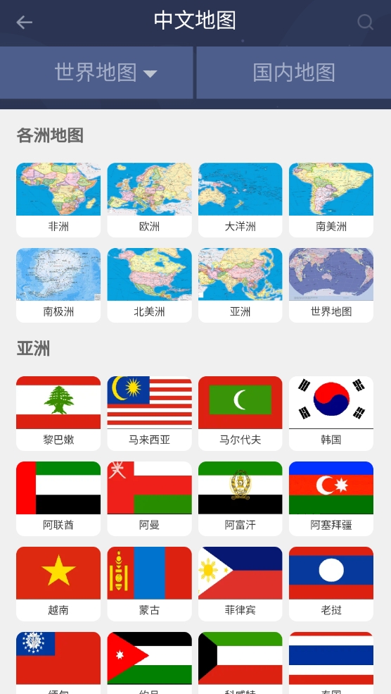 世界地图是一款非常实用的地图软件,软件内收集了全世界所有的国家详细信息,如自然环境、国家历史、名族文化等,让用户能够足不出户就能看遍世界,学到很多有用的地理知识,而且软件里还有着路径规划、定位、搜索、导航等实用功能,让在国外旅游的用户能准确的查看周边所有的信息,非常适合喜欢在国外到处旅游的用户们下载体验。