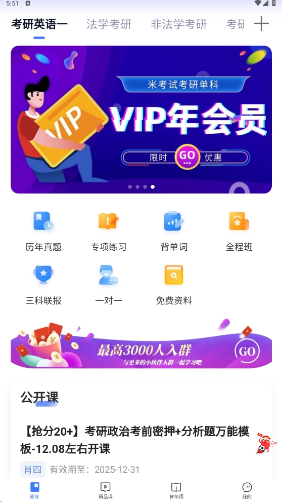 1、下载安装好海健身并点击进入,在主页面有着考研英语、法学考研、考研政治等多种单科供用户选择。