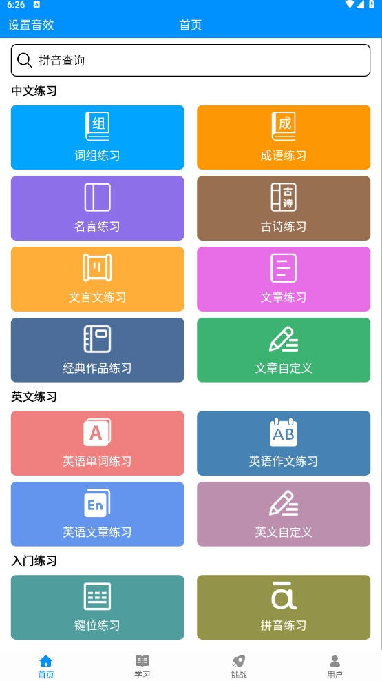 拼音打字练习是一款专门进行打字和拼音训练的学习应用,在软件内有着大量拼音打字练习文章,其中还包含了小学一到六年级的课文,可以很好地帮助小学生、零基础用户轻松成为打字高手,还为用户提供了文言文练习功能,通过练习文言文让用户能够快速背诵各种经典文言文,欢迎各大有需求的用户前来下载。