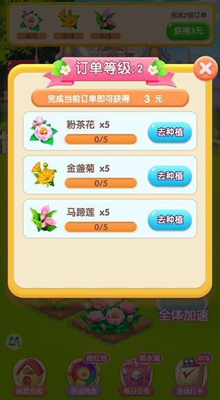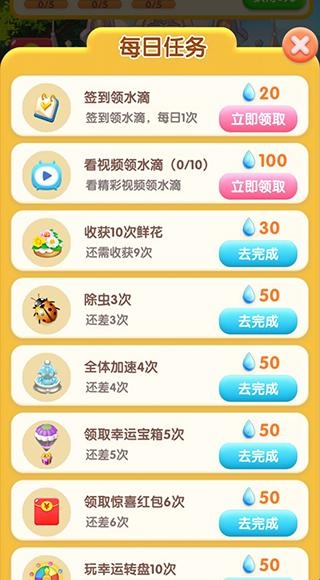 4、参与每日任务可免费大量的水滴奖励,水滴可用于加速、购买花种或解锁更多的土地。