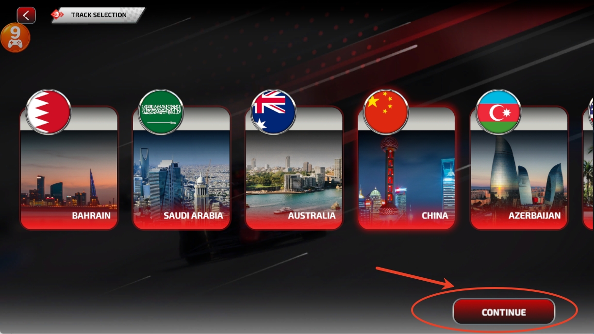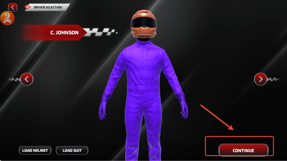 3、然后挑选喜欢的头盔颜色,接着点击CONTINUE,选择喜欢的地图进行比赛。