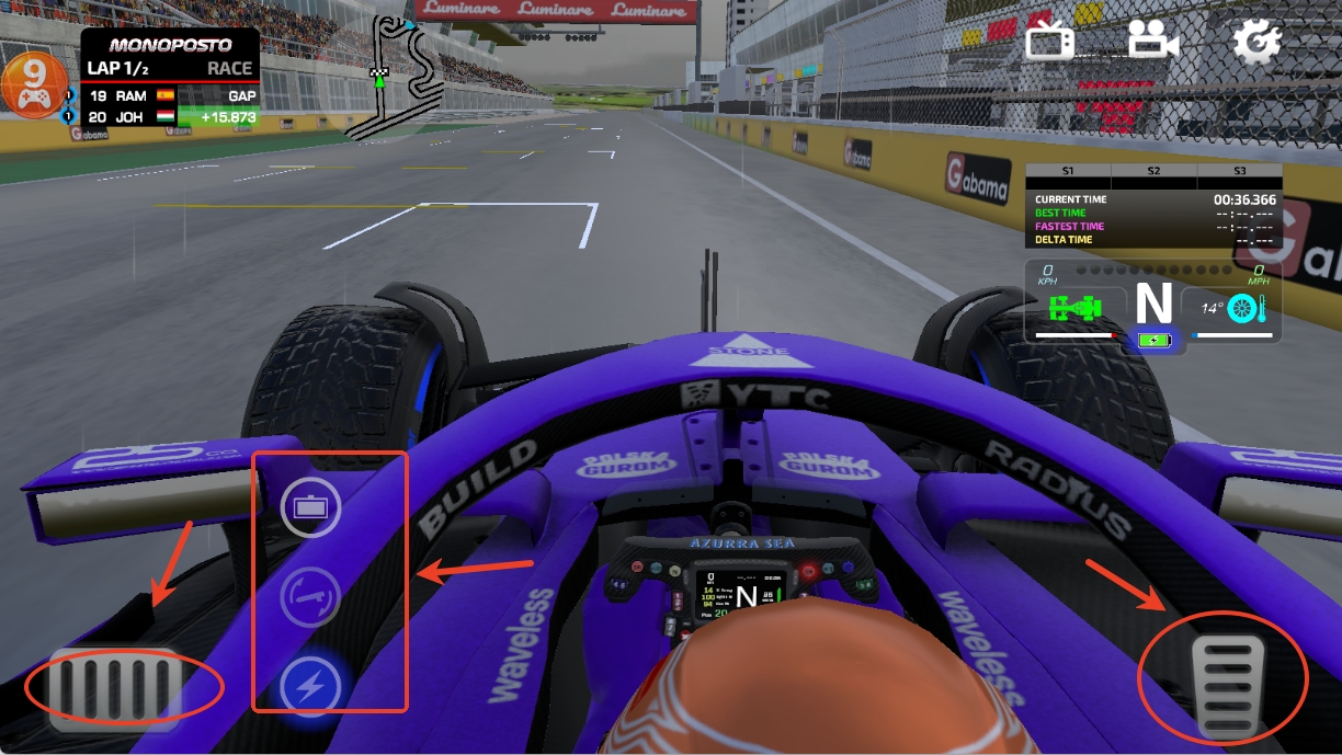 4、左下角是倒车键,旁边一排使加速键和后视镜的按键,右下角是前进键。