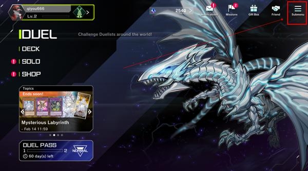 1、在本站下载好灌篮高手后并打开,首先我们打开游戏王大师决斗手机版,进入游戏之后点击右上角Submenu。