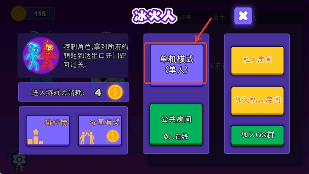 1、在本站下载好森林冰火人2后并打开,进入主页面选择单机模式,如果游戏好朋友一起游玩的话就可以开房间。