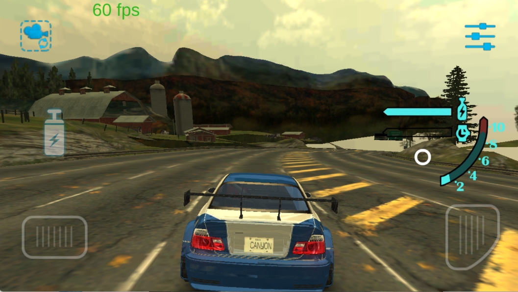 3、游戏中有两种模式可以切换,当前模式是通过左右晃动手机来控制车的方向,右下角按键加速,左下角刹车。