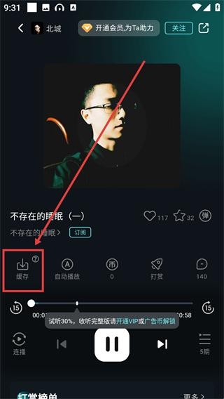 3、在播放页面找到并点击缓存按钮,系统会弹出缓存操作的提示弹窗,此时就可以准备对这条音频进行缓存了。