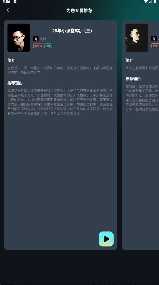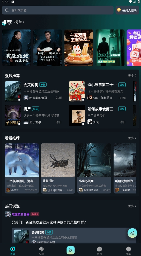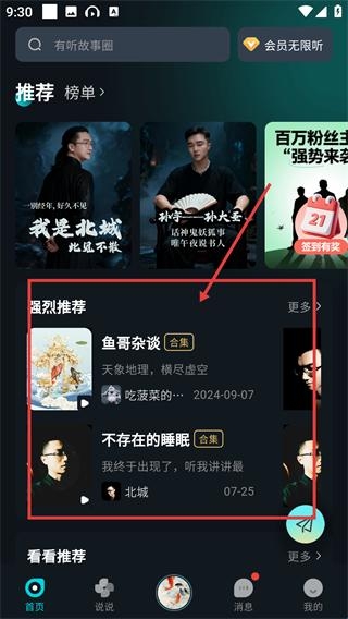 1、在本站下载好有听故事圈后点击进入,在首页的强烈推荐板块挑选你感兴趣的内容,点击之后即可进入对应的内容合集页面。