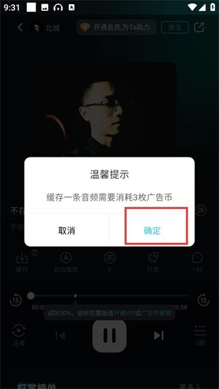 4、当看到缓存提示弹窗时,点击确定按钮,即可消耗3枚广告币完成该音频的缓存操作。