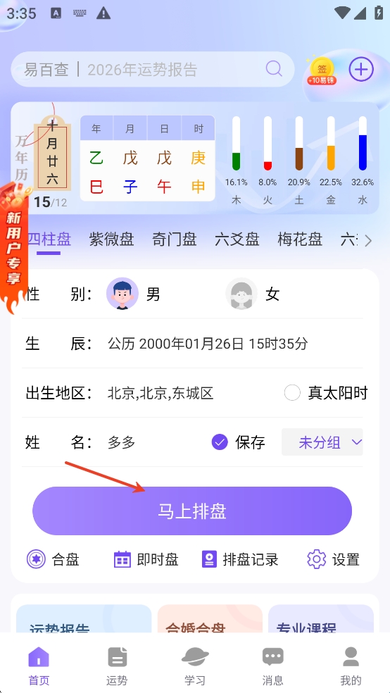 1、在本站下载好易百查后点击进入,在首页根据自己的需求选择对应的排盘方式。