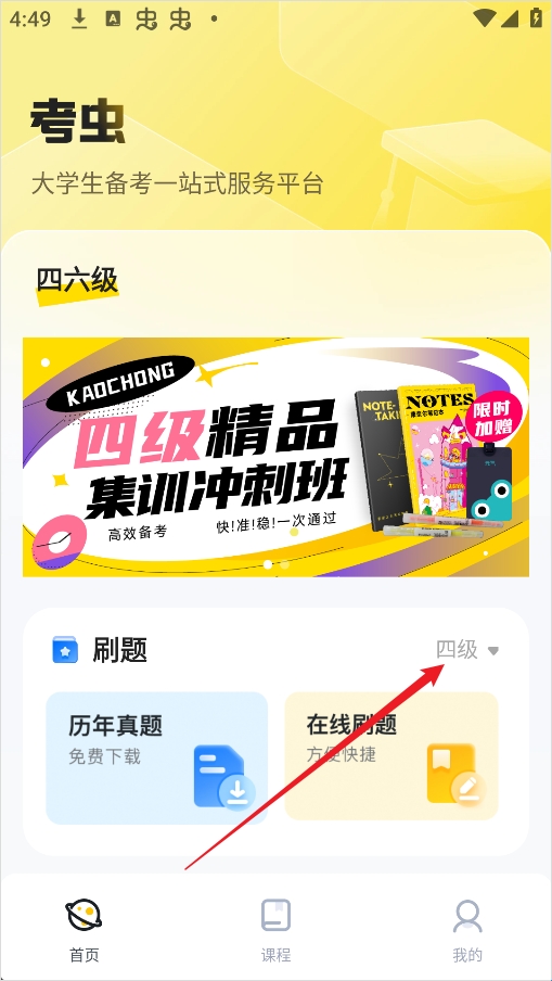 1、打开考虫App后,在主界面右侧找到“四级”入口并点击进入。