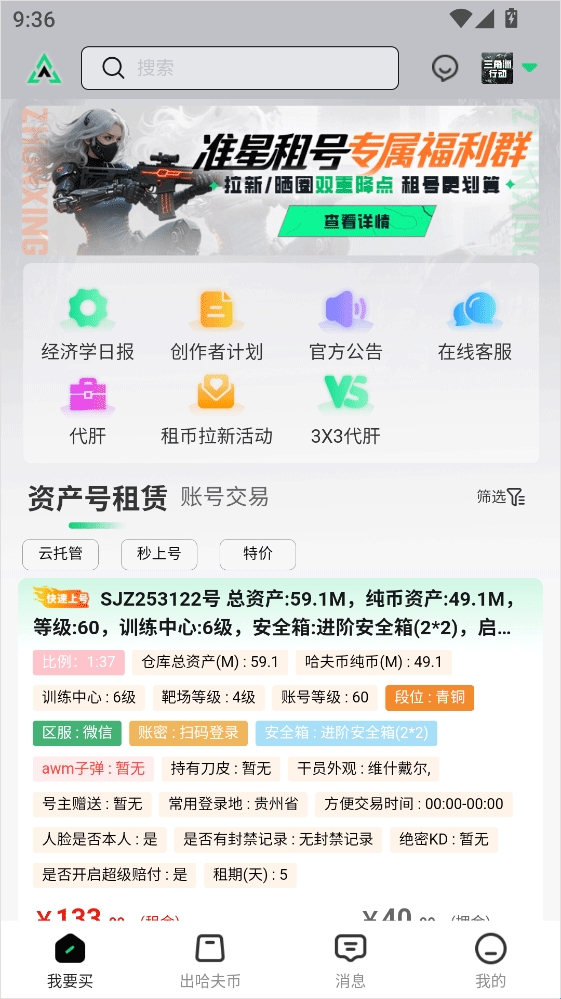 准星代售是一款专注于游戏虚拟资产交易的综合服务软件。软件以安全、高效、便捷为核心,为用户提供了账号买卖、装备道具交易、账号估价、回收转卖等一站式服务,账号的信息一目了然,为玩家打造可靠的游戏资产流通渠道,也可以在线出售自己的账号哦。