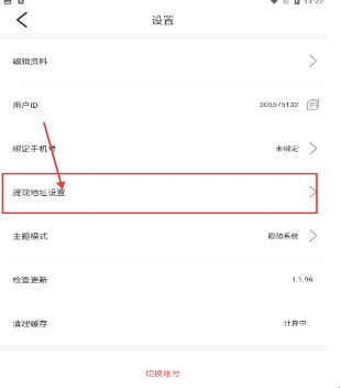 2、在【设置】页面,点击【提现地址设置】选项,可进入银行卡提现信息填写页面。