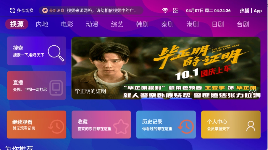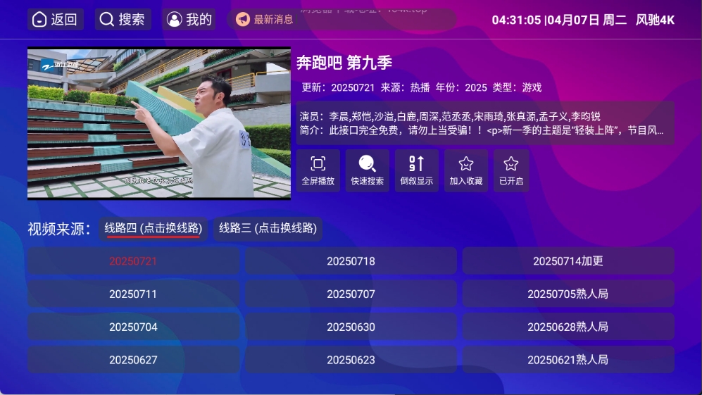 风驰4K是一款整合全网多个平台影视资源内容的观影APP。软件的资源库持续高频更新,热门剧集每日同步上线,支持多源切换,无需会员或额外付费,通过影片关键词、演员或节目名称来快速定位影片,国内外的影视作品全部都可以搜索点击播放哦。